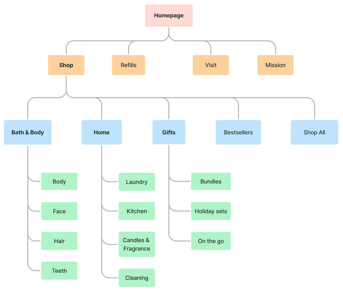 To address the confusion users had with the main navigation, I conducted an open card sort where I asked 10 participants to come up with their own terms to categorize The Source Zero's products. I analyzed the results to identify converging themes and created a site map that better reflected how users thought products should be grouped -